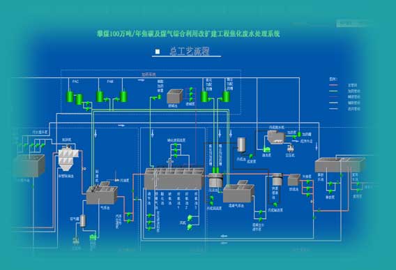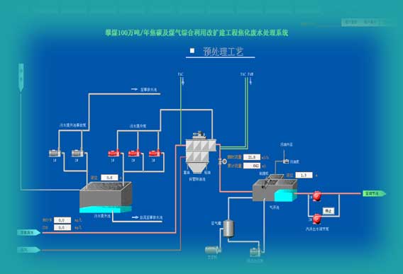 系统功能:动态图形显示水处理工艺流程、工艺参数值和工艺设备的运行状态。