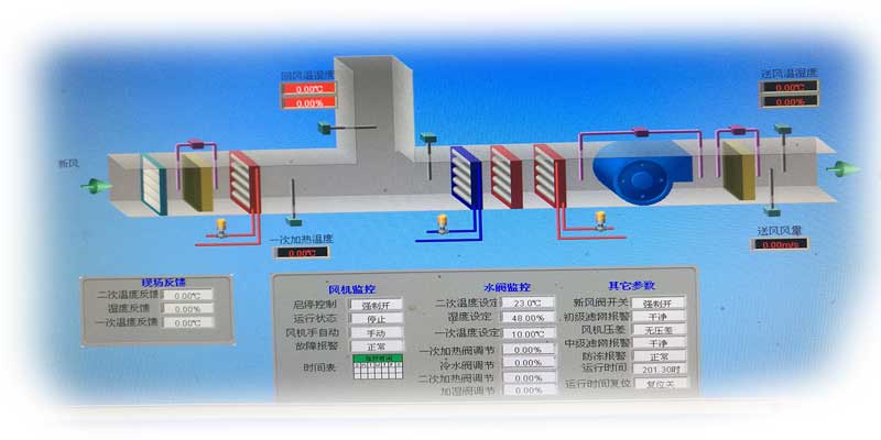 中央空调风系统节能舒适控制主要由空调机组的风系统的控制、新风机组的控制、回风机组、排风机组的控制,环境温度调节、环境湿度调节和空气质量调节。