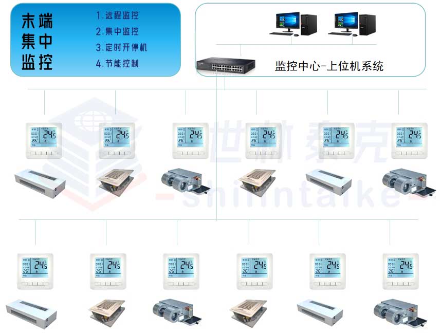 远程、集中管控、上位机集中控制、集中管理;夏季模式与冬季模式。定时开关机,一键开机和一键停机