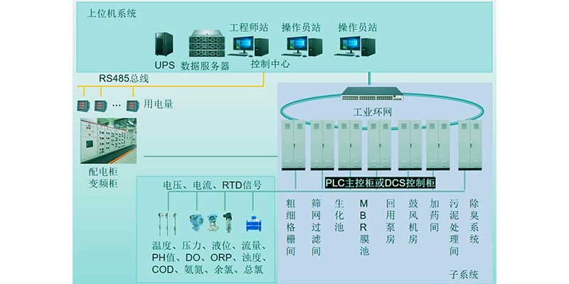 污水处理控制系统包括PLC控制柜或DCS控制柜、上位机软件、工程师站、操作员、历史数据库服务器、UPS、液位、流量、温度、压力、曝气风量、PH值、DO、余氯、总氯、ORP、COD、氨氮、总磷等现场仪表
