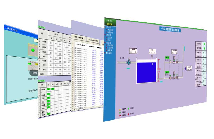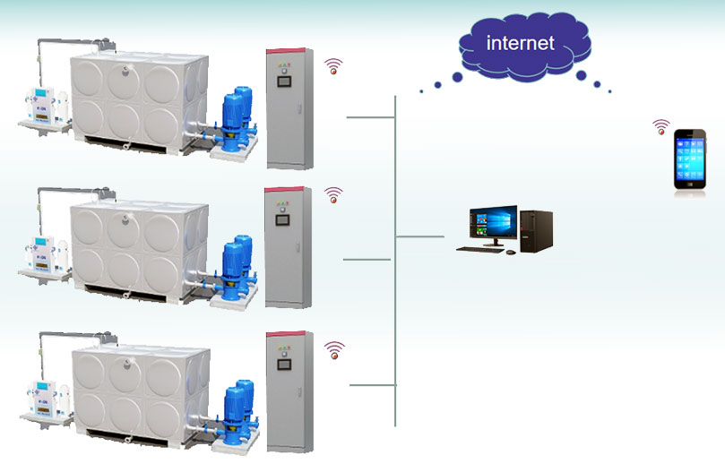 PLC控制柜(带触摸屏)或变频控制柜、压力变送器、液位变送器、流量传感器、远程集中管控