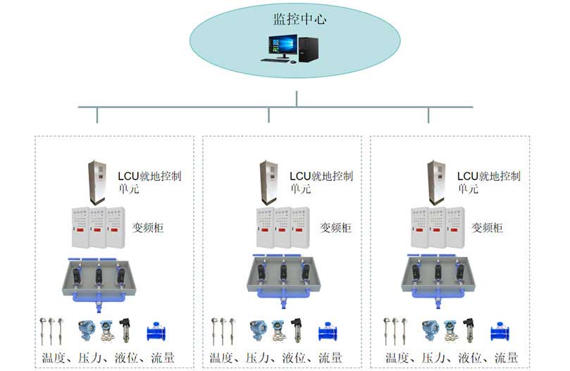控制中心、光纤或4G或物联网、PLC控制站、现场仪表,控制中心由计算机或手持终端APP实现控制,就地通过控制柜触摸屏、电气柜按钮和变频器、机旁按钮箱等控制。场仪表主要由液位、流量、压力等组成