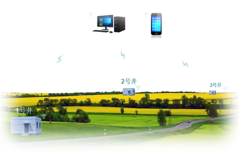 上位机、光纤网络或4G无线或物联网、井泵控制箱、现场压力变送器和流量计