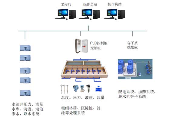 自来水厂自动化控制系统组成: 控制中心(服务器、工程师站、操作员站、UPS、大屏)、光纤网络、PLC控制主站、现场仪表、抽真空系统、加药系统、水源井泵控制、