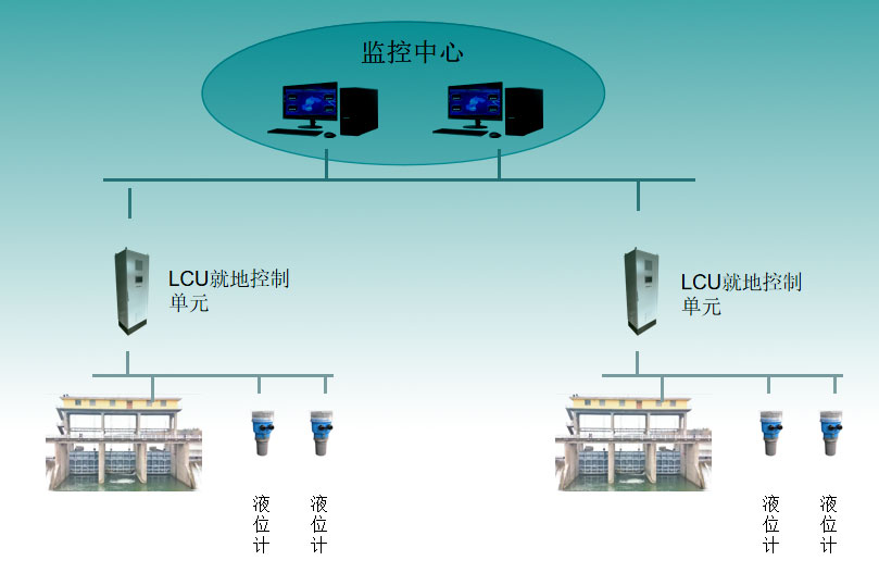 控制中心上位机、光纤网络、4G无线网络或物联网、PLC控制柜、闸门开度载荷电气柜、液位计、视频监控