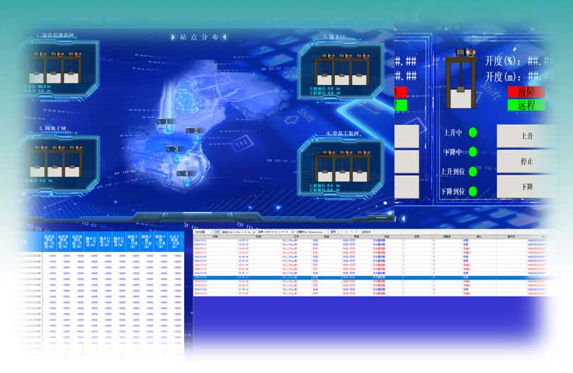 动态图形显示:闸门开度、载荷、三相电压、三相电流、功率、用电量、上下游液位、闸门状态...